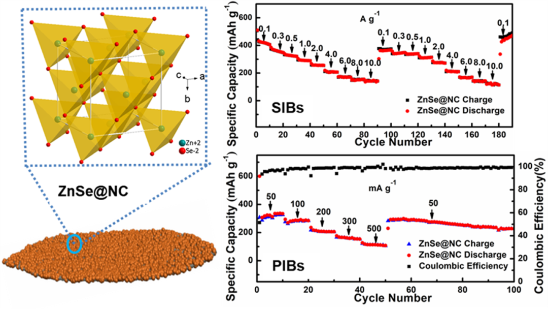 钠离子和钾离子二次电池凭借钠和钾资源丰富,分布区域广,物理化学性质与锂相似等诸多优势,被认为是未来有望取代储量有限、价格高昂的锂离子二次电池的新型理想二次电池。然而,其在充放电过程中明显的体积膨胀效应会引起电极材料结构粉化与团聚,导致电池倍率性能和循环寿命不能满足实际需求。针对上述问题,山东大学徐立强教授和烟台大学姜付义教授团队董才富博士在锌基金属化合物的微纳结构与性能调控方面开展了系统和深入的研究。通过温和的溶剂热与后续硒化处理相结合的策略可控合成了氮掺杂碳包覆的柳叶状ZnSe(ZnSe@NC)。特别是所得材料在作为钠离子电池负极材料时,表现出了突出的倍率性能(0.1 A g−1和10 A g−1的电流密度下,其可逆比容量分别为440.3和 144.4 mAh g−1)和超长的循环寿命(8 A g−1的电流密度下,经过3200次循环后,可逆比容量仍可保持在242.2 mAh g−1)。在作为钾离子电池负极材料时,同样表现出了很好的循环稳定性,在0.2 A g−1的电流密度下,经过1500次循环后,可其逆比容量仍可达71.4 mAh g−1。作者利用恒电流间歇滴定技术(GITT),不同扫速的循环伏安(CV)和交流阻抗谱(EIS)等电化学手段对其突出的电化学性能进行了动力学解析,结果表明,高的赝电容贡献、低的反应阻抗和电荷传递阻抗是材料表现出优异性能的重要原因。此外,作者还通过非原位XRD和HRTEM分析相结合的方法对其充放电机理进行了深入的探究。相关论文在线发表在国际著名期刊Small上 (Willow-Leaf-Like ZnSe@N-Doped Carbon Nanoarchitecture as a Stable and High-Performance Anode Material for Sodium-Ion and Potassium-Ion Batteries,Small, 2020, 2004580;Small: IF = 11.459)。(DOI: 10.1002/smll.202004580) 上述有关ZnSe电极材料的可控制备、动力学分析及机理研究等有望为系列新型高性能钠离子和钾离子电池电极材料的研发提供较重要的实验数据参考和技术支持。 烟台大学讲师董才富博士是该论文的第一作者,山东大学徐立强教授和烟台大学姜付义教授为共同通讯作者。感谢国家自然科学基金和省部级基金的支持;同时感谢钱逸泰院士团队和烟台大学环境与材料科学工程学院为我们的研究提供的支持。 |